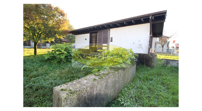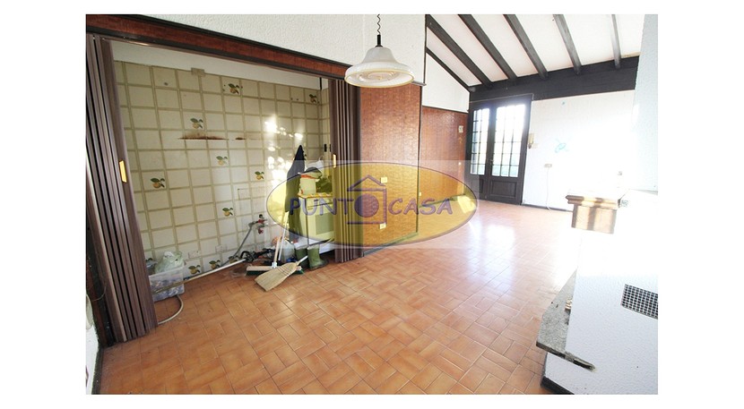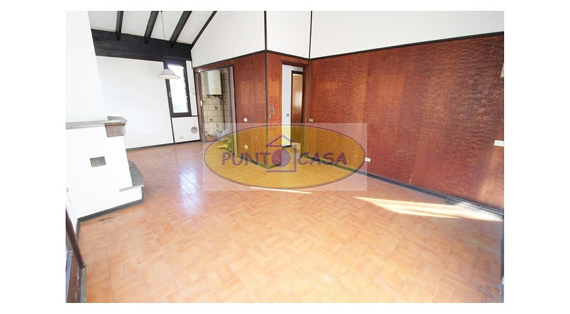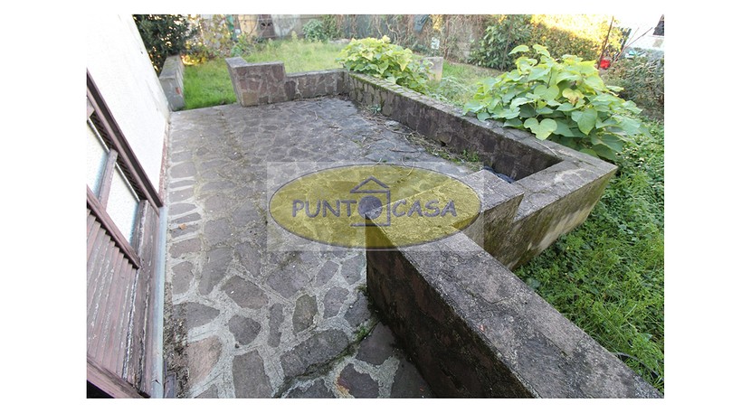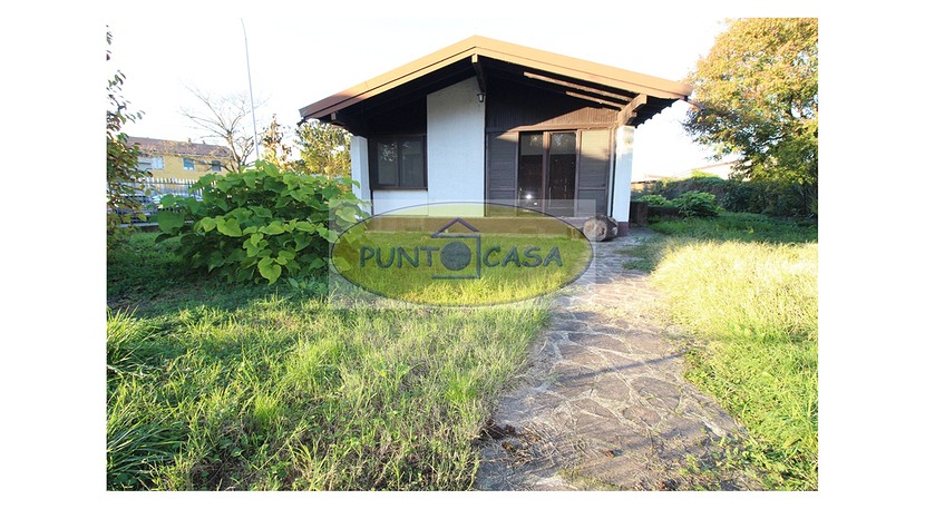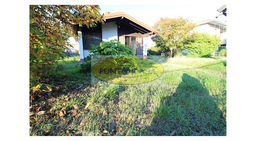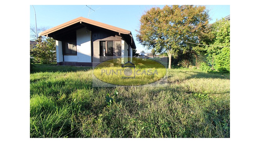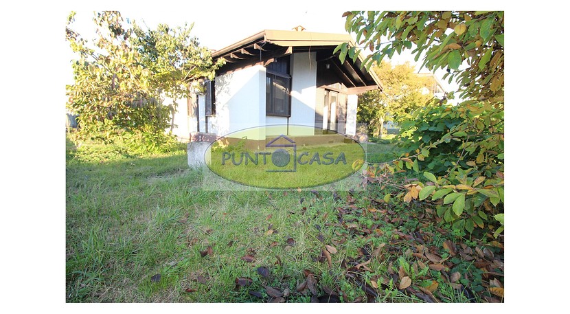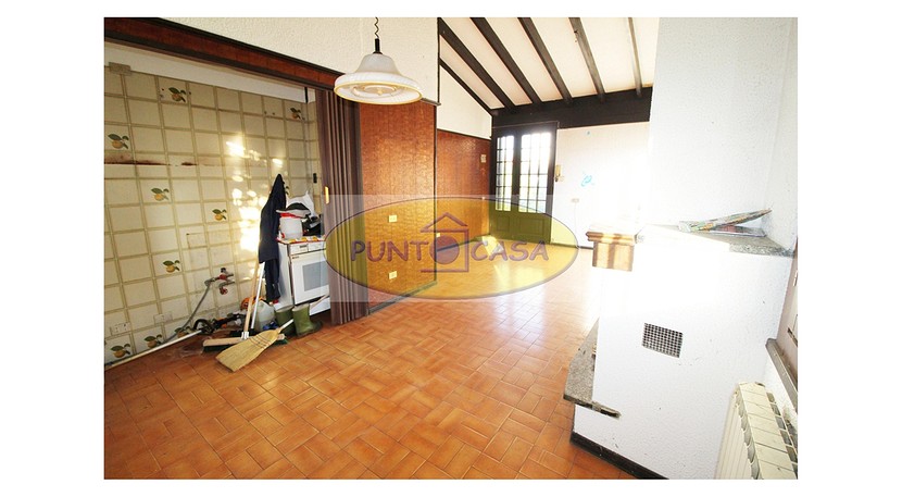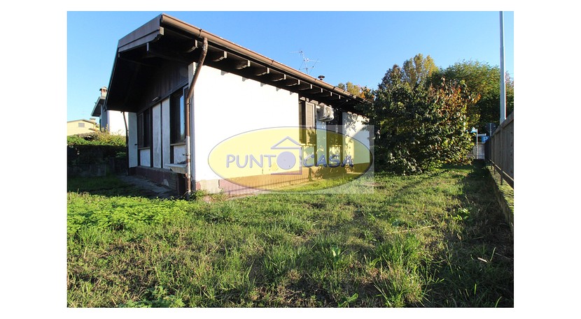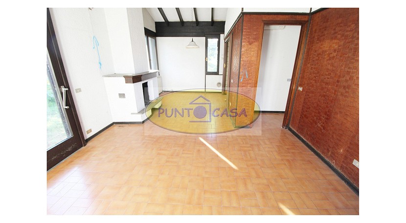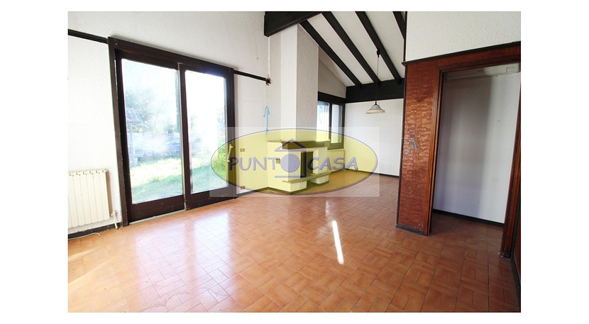 Soggiorno con ampia vetrata scorrevole con vista sul giardino, camino, zona pranzo con cucinotto, disimpegno, camera da letto matrimoniale, camera da letto singola, bagno con doccia, box auto, area esterna di circa 500 mq, in parte giardino piantumato e in parte cortile e posti auto.