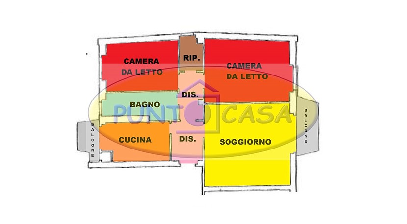 Ingresso, disimpegno, soggiorno con accesso al balcone, cucina abitabile con accesso al secondo balcone, camera da letto matrimoniale, seconda camera da letto, bagno con vasca, ripostiglio, cantina e box.